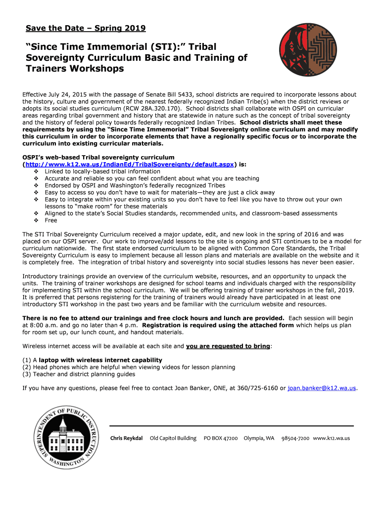 Save the Date Spring 2019Since Time Immemorial (STI): Tribal Sovereignty Curriculum Basic and Training of Trainers Workshops Effective July 24, 2015, with the passage of Senate Bill 5433, school districts
