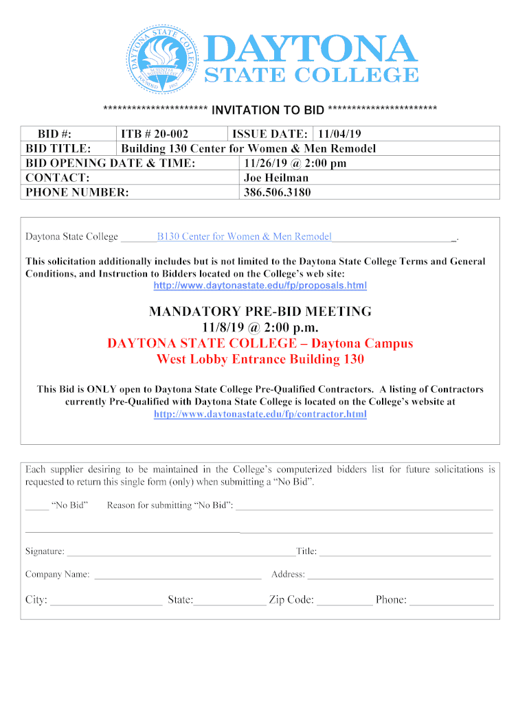 ********************** INVITATION TO BID *********************** BID #: ITB # 20002 ISSUE DATE: 11/04/19 BID TITLE: Building 130 Center for Women & Men Remodel BID OPENING DATE & TIME: 11/26/19 2:00
