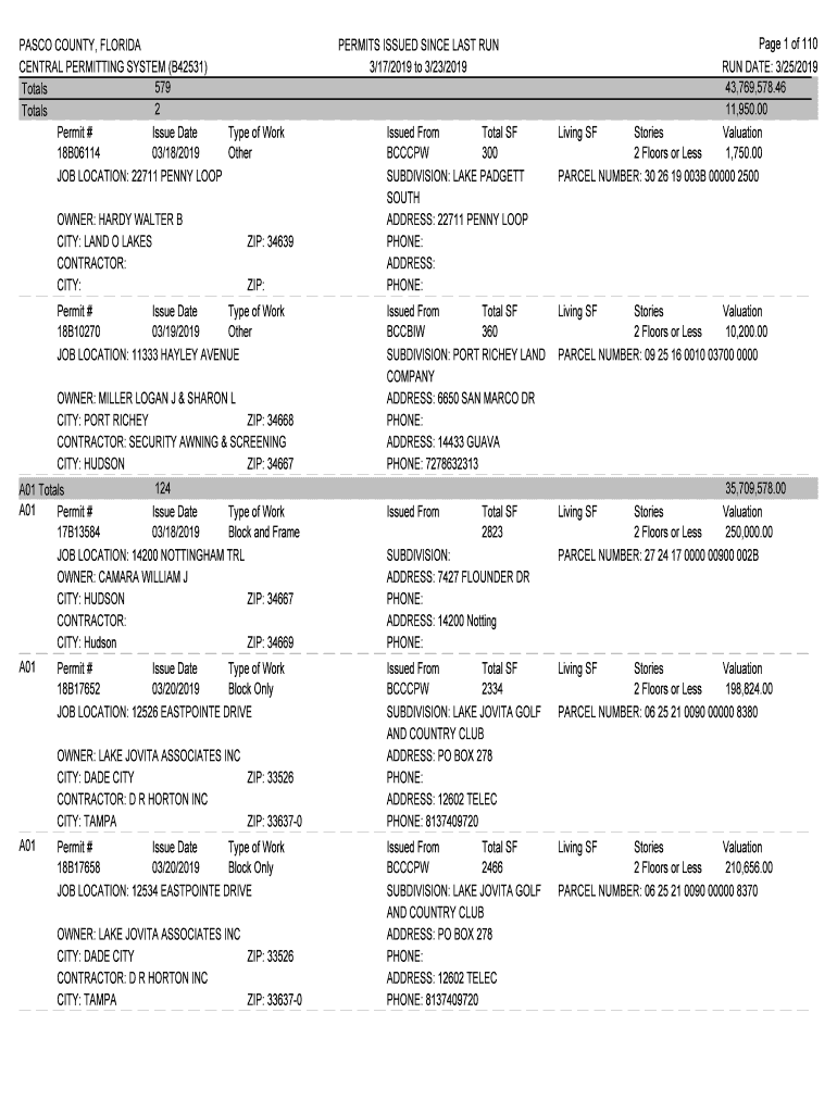 PASCO COUNTY, FLORIDA CENTRAL PERMITTING SYSTEM (B42531) 579 Totals 2 Totals Permit # Issue Date Type of Work 18B06114 03/18/2019 Other JOB LOCATION: 22711 PENNY LOOP OWNER: HARDY WALTER B CITY: LAND