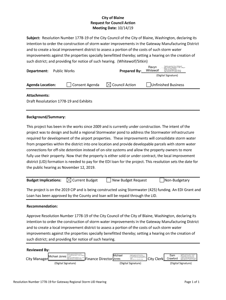 Subject: Resolution Number 177819 of the City Council of the City of Blaine, Washington, declaring its