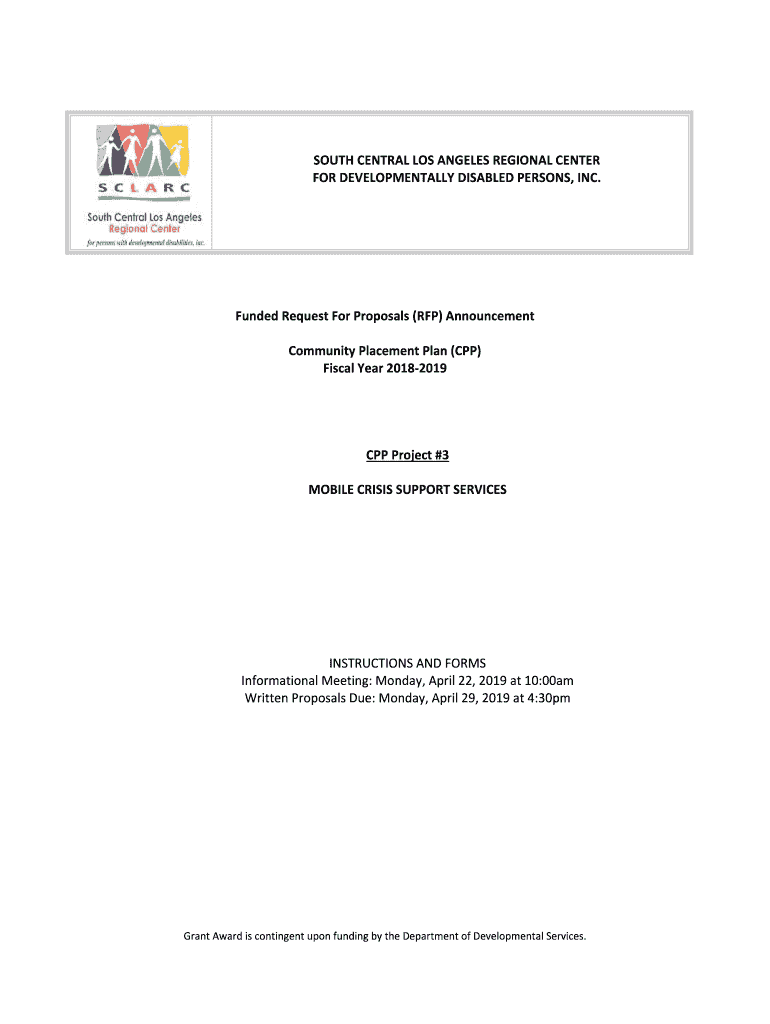SOUTHCENTRALLOSANGELESREGIONALCENTER FORDEVELOPMENTALLYDISABLEDPERSONS, INC. FundedRequestForProposals(RFP)Announcement CommunityPlacementPlan(CPP) FiscalYear20182019 Project×3 MOBILECRISISSUPPORTSERVICES
