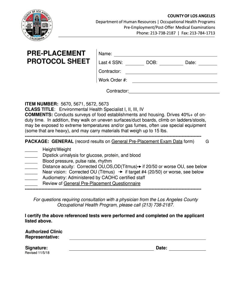 COUNTYOFLOSANGELES DepartmentofHumanResources OccupationalHealthPrograms PreEmployment/Poster MedicalExaminations Phone:2137382187 Fax:2137841713PREPLACEMENT PROTOCOL Sheena: Last 4 SSN:DOB:Date:Contractor: