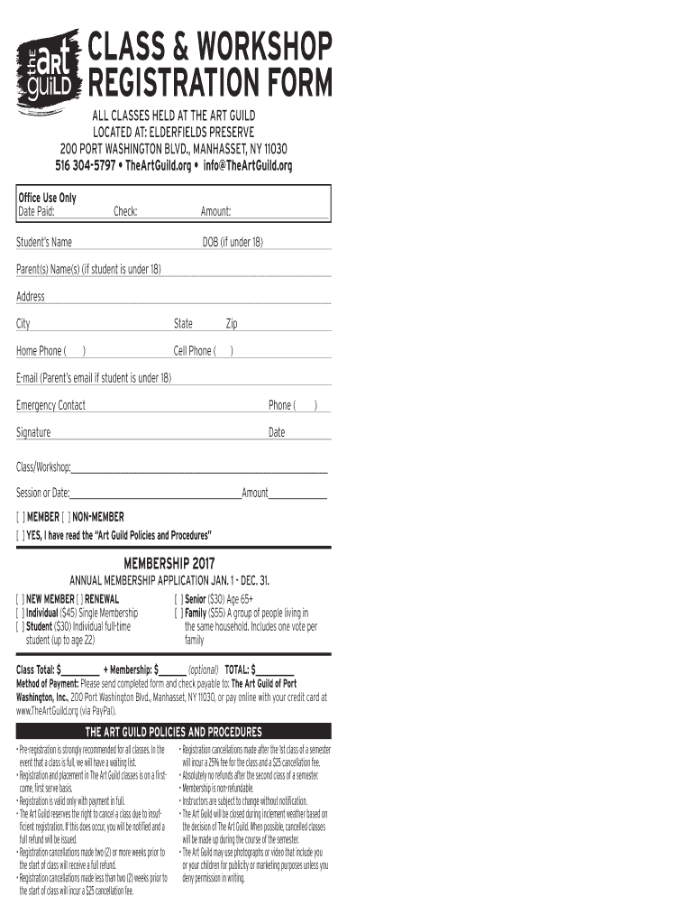 CLASS & WORKSHOP REGISTRATION FORMULAS & WORKSHOP REGISTRATION FORMAL CLASSES HELD AT THE ART GUILD LOCATED AT: ELDERFIELDS PRESERVE 200 PORT WASHINGTON BLVD., MANASSEH, NY 11030 516 3045797 TheArtGuild.org