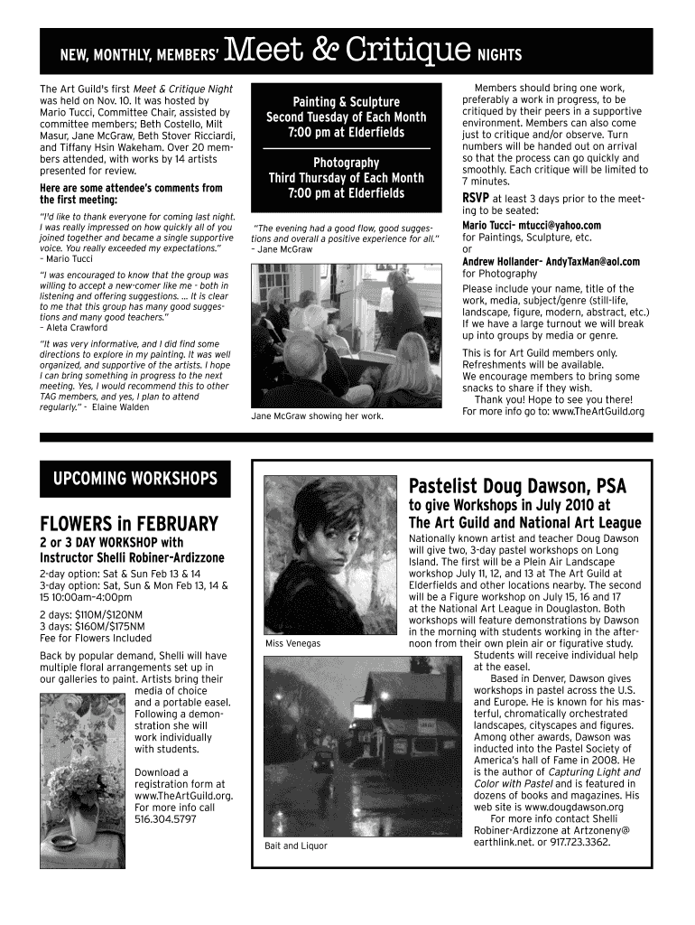 NEW, MONTHLY, MEMBERSMeet & Critique Nights Art Guild's first Meet & Critique Night was held on Nov. 10. It was hosted by Mario Gucci, Committee Chair, assisted by committee members; Beth Costello,
