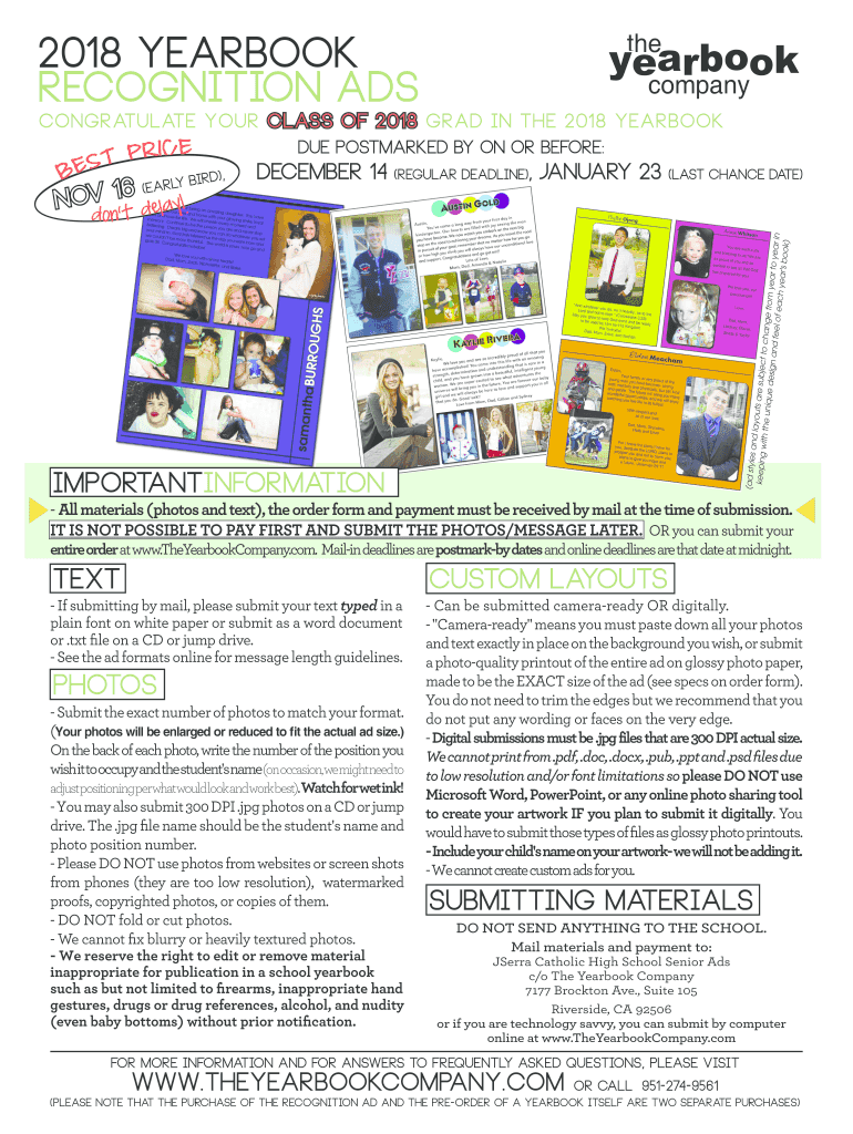 The yearbook company2018 yearbook recognition congratulate Your class of 2018 grad in the 2018 yearbook PRICED UE postmarked by ON OR BEFORE: rd), bi (early 6 1 v o N don 't delay! December 14 (Regular