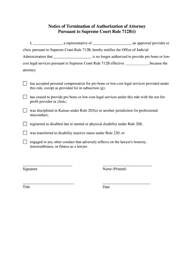 Notice of Termination of Authorization of Attorney Pursuant to Supreme Court Rule 712B(i) I, a representative of, an approved provider or clinic pursuant to Supreme Court Rule 712B, hereby notifies