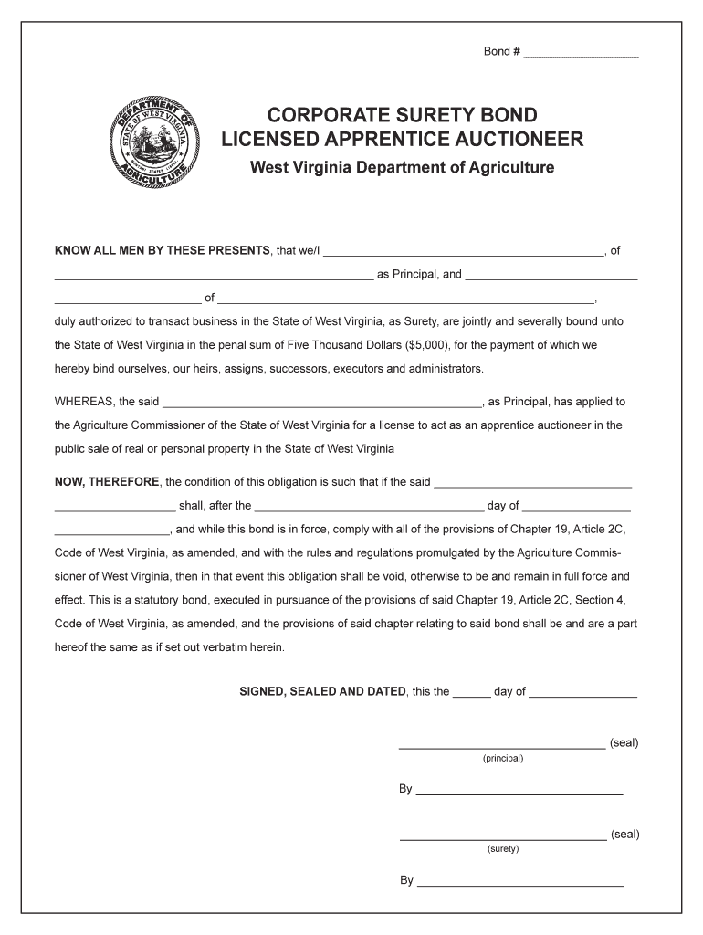 Bond # CORPORATE SURETY BOND LICENSED APPRENTICE AUCTIONEER West Virginia Department of AgricultureKNOW ALL MEN BY THESE PRESENTS, that we/I, of as Principal, and of, duly authorized to transact business