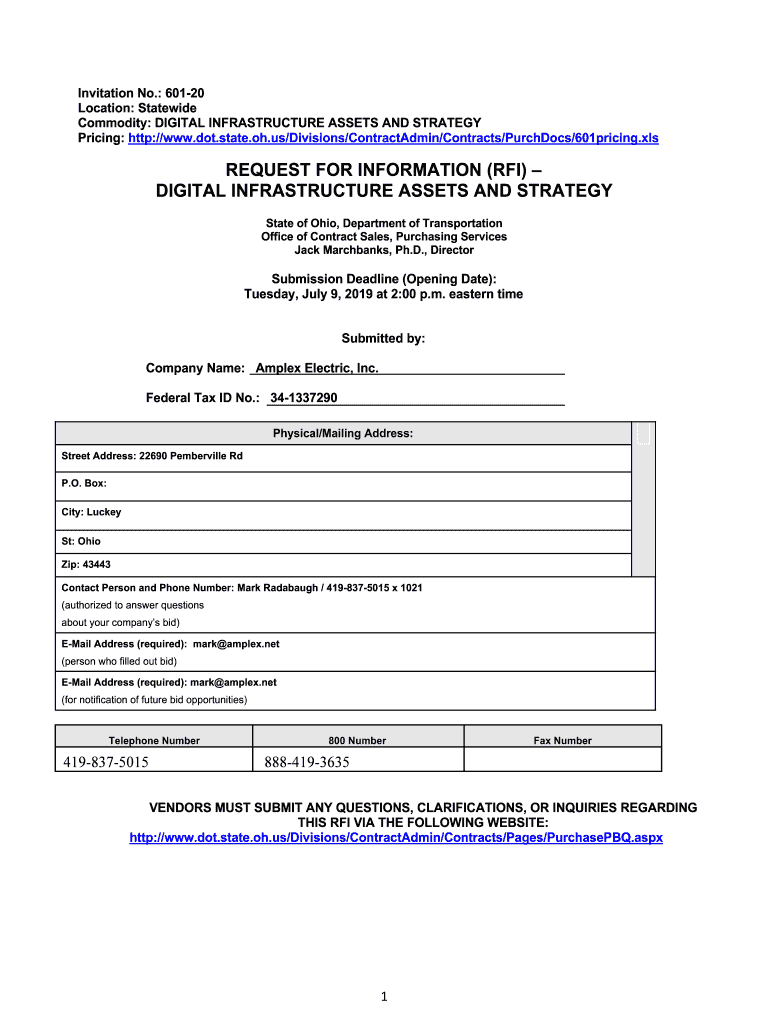 Invitation No.: 60120 Location: Statewide Commodity: DIGITAL INFRASTRUCTURE ASSETS AND STRATEGY Pricing: http://www.dot.state.oh.us/Divisions/ContractAdmin/Contracts/PurchDocs/601pricing.xlsREQUEST