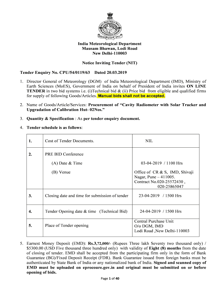 India Meteorological Department Assam Shawn, Lodi Road New Delhi110003 Notice Inviting Tender (NIT) Tender Inquiry No. CPU/54/0119/63Dated 20.03.20191. Director General of Meteorology (DAM) of India