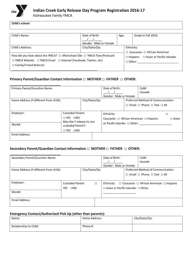 Indian Creek Early Release Day Program Registration 201617 Milwaukee Family YMCA Child's school:Child's Name:Child's Address:Date of Birth: / / Gender: Male or Female City/State/Zip:How did you hear
