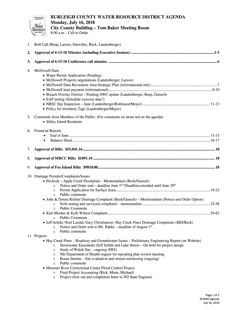 BURLEIGH COUNTY WATER RESOURCE DISTRICT AGENDA Monday, July 16, 2018, City County Building Tom Baker Meeting Room 8:00 a.m. Call to Order 1. Roll Call (Keep, Larson, Detailer, Beck, Vandenberg)2.