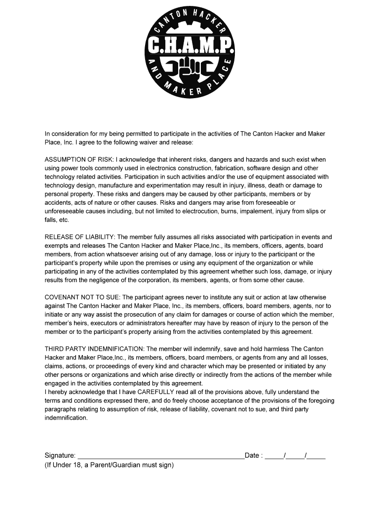Get the free Release of Liability Waiver - Canton Hacker and Maker Place