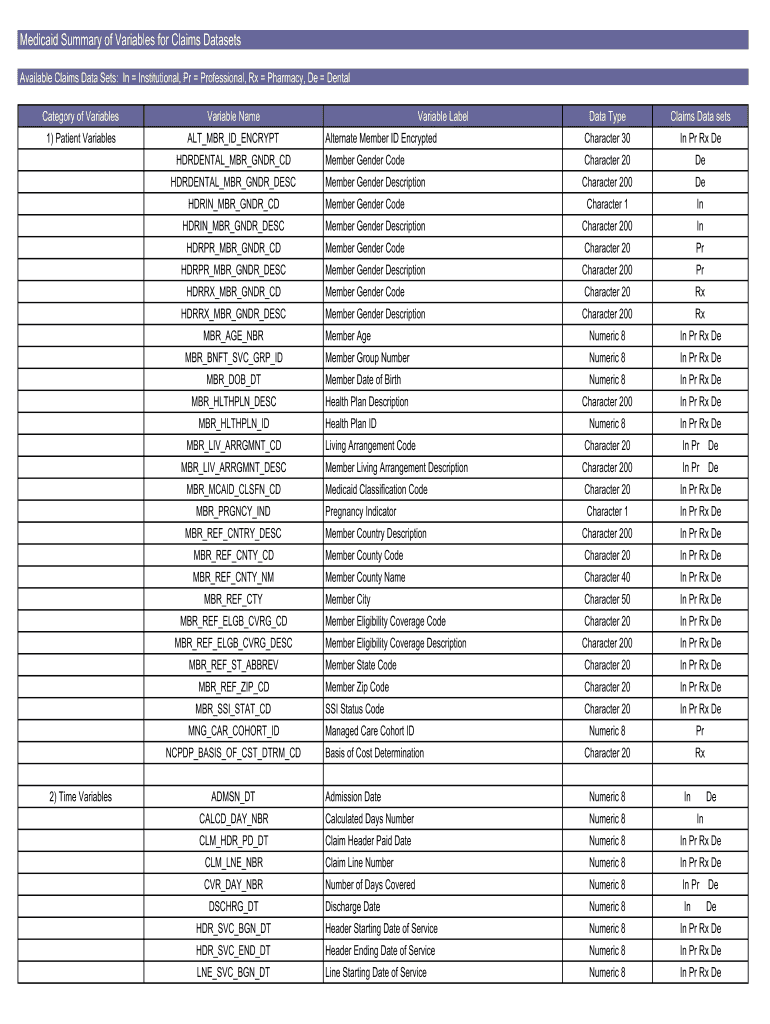Medicaid Summary of Variables for Claims Datasets Available Claims Data Sets: In Institutional, Pr Professional, Rx Pharmacy, De Dental Category of VariablesVariable Name1) Patient Variables MBR ID