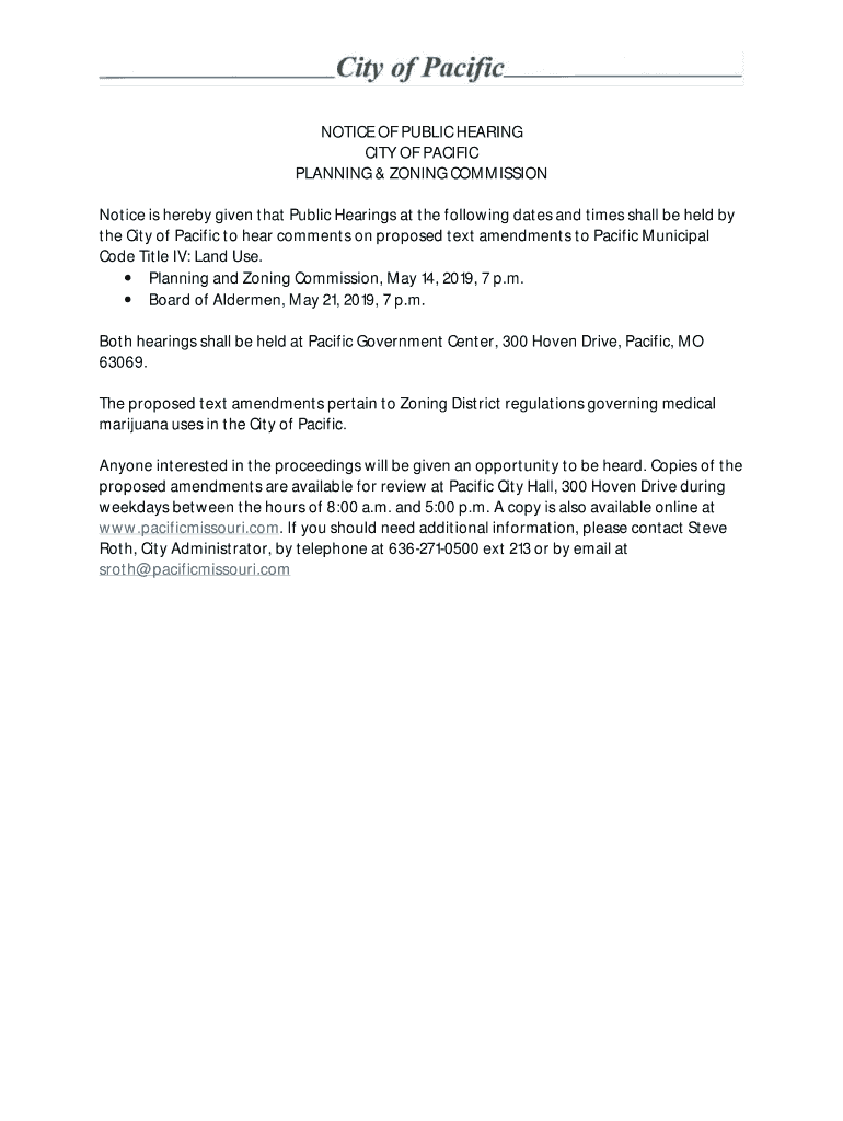 NOTICE OF PUBLIC HEARING CITY OF PACIFIC PLANNING & ZONING COMMISSION Notice is hereby given that Public Hearings at the following dates and times shall be held by the City of Pacific to hear comments