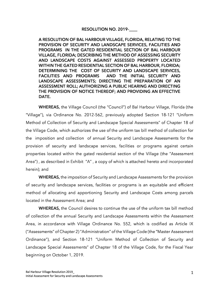 RESOLUTION NO. 2019 A RESOLUTION OF BAD Harbor VILLAGE, FLORIDA, RELATING TO THE PROVISION OF SECURITY AND LANDSCAPE SERVICES, FACILITIES AND PROGRAMS IN THE GATED RESIDENTIAL SECTION OF BAD Harbor