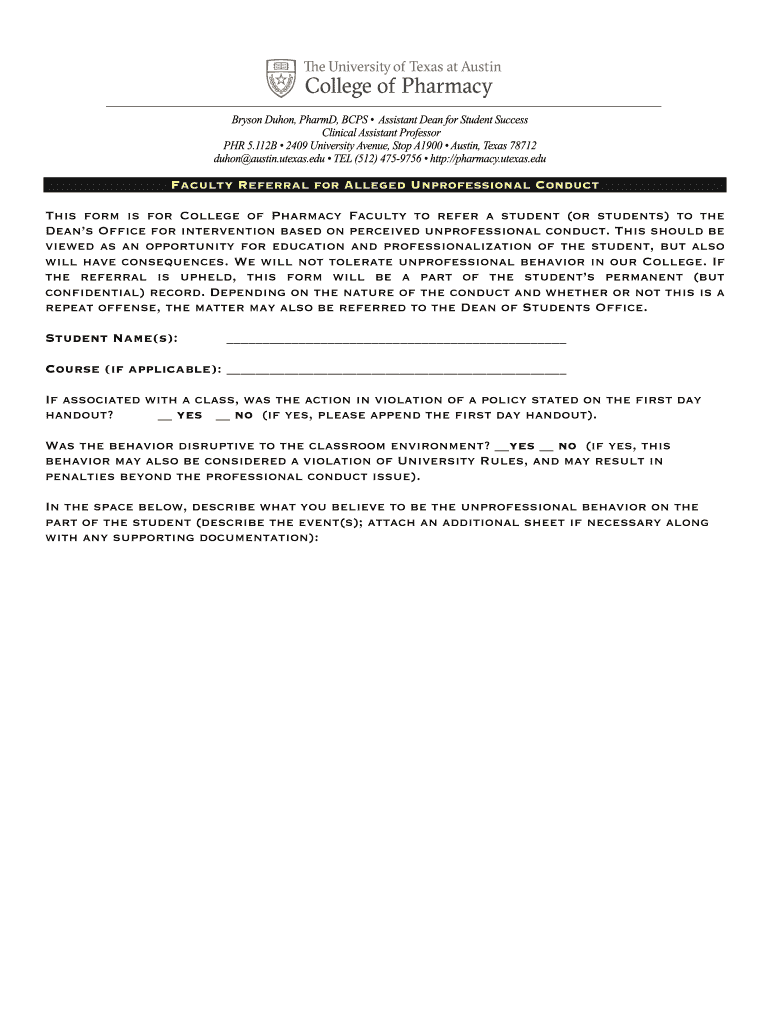 Get the free Faculty Referral for Alleged Unprofessional Conduct - College ... - pharmacy utexas