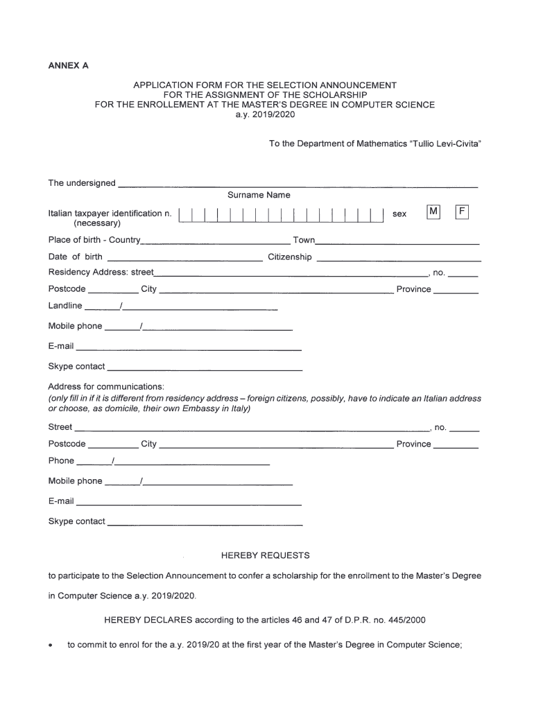 ANNEX A APPLICATION FORM FOR THE SELECTION ANNOUNCEMENT FOR THE ASSIGNMENT OF THE SCHOLARSHIP FOR THE ENROLLMENT AT THE MASTER IS DEGREE IN COMPUTER SCIENCE a.y. 2019/2020To the Department of Mathematics