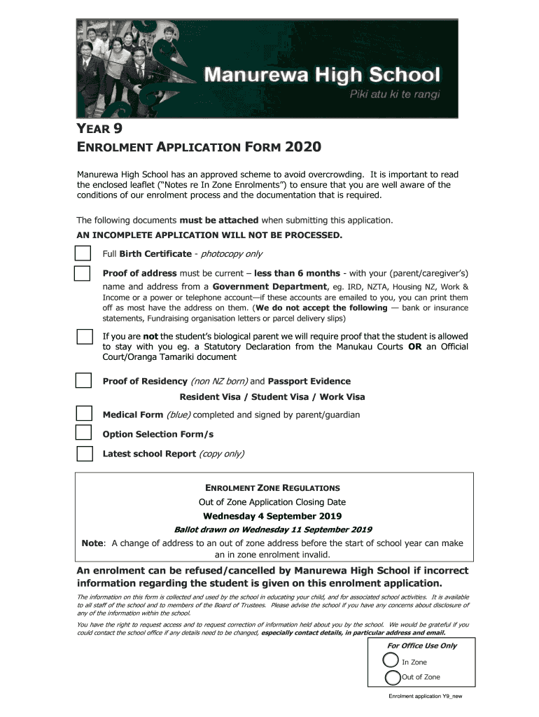YEAR 9 Enrollment APPLICATION FORM 2020 Manure High School has an approved scheme to avoid overcrowding. It is important to read the enclosed leaflet (Notes re In Zone Enrollments) to ensure that