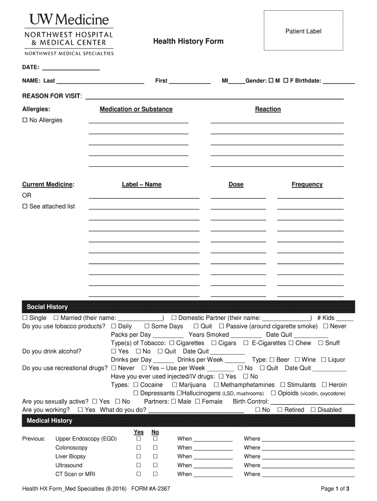 Patient Dabo Health History Format: NAME: LastFirstGender: M F Birthdate:REASON FOR VISIT: Allergies:Medication or SubstanceReaction No AllergiesCurrent Medicine:Label NameDoseFrequencyOR See attached