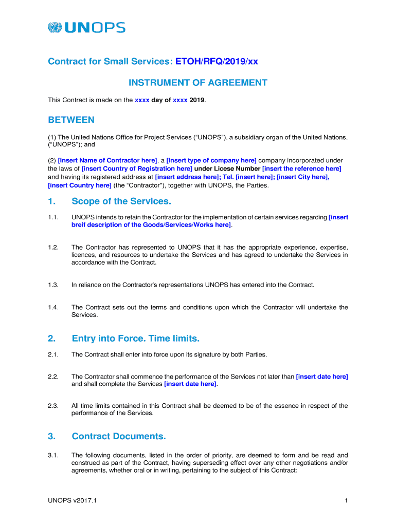 Contract for Small Services: ETON/RFQ/2019/xx INSTRUMENT OF AGREEMENT This Contract is made on the XXX day of XXX 2019.BETWEEN (1) The United Nations Office for Project Services (UNITS), a subsidiary