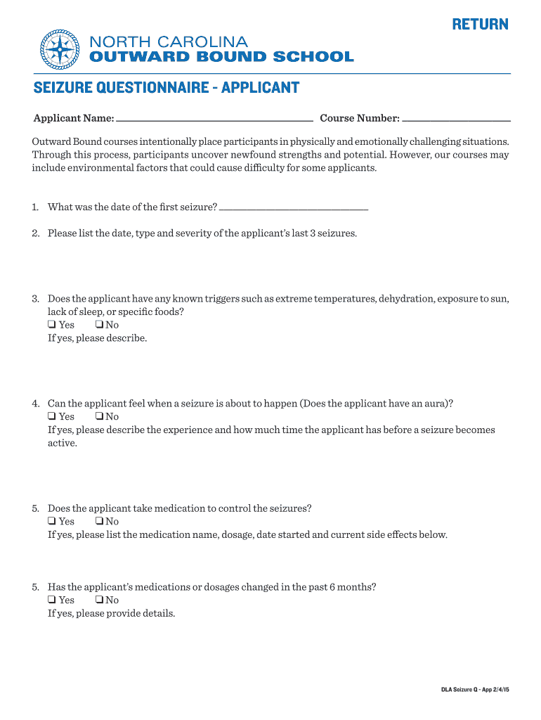 RETURNSEIZURE QUESTIONNAIRE APPLICANT Name: Course Number: Outward Bound courses intentionally place participants in physically and emotionally challenging situations. Through this process, participants
