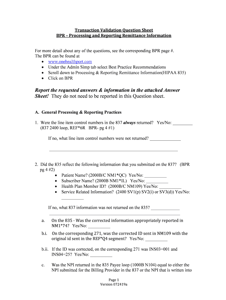 Transaction Validation Question Sheet BPR Processing and Reporting Remittance Information For more detail about any of the questions, see the corresponding BPR page #. The BPR can be found at www.onehealthport.com