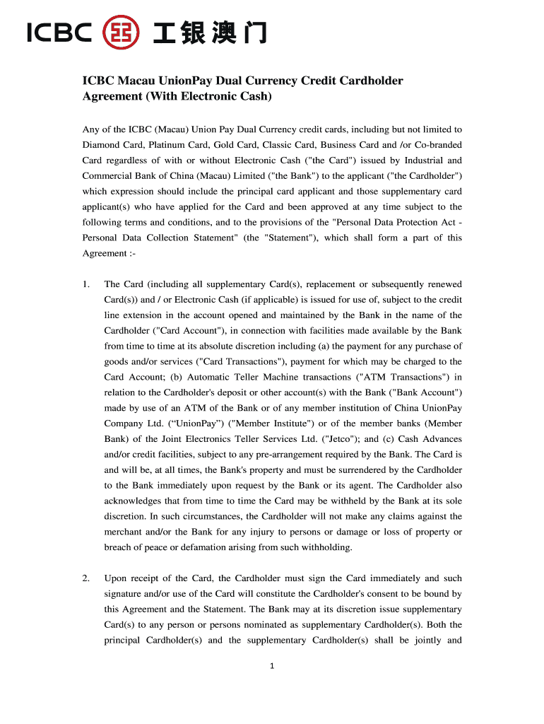ICBC Macau UnionPay Dual Currency Credit Cardholder Agreement (With Electronic Cash) Any of the ICBC (Macau) Union Pay Dual Currency credit cards, including but not limited to Diamond Card, Platinum