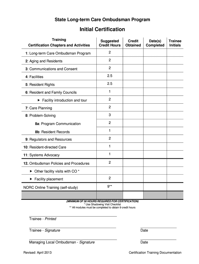 State Long term Care Ombudsman ProgramInitial Certification Training Certification Chapters and ActivitiesSuggested Credit Hours1: Long term Care Ombudsman Program22: Aging and Residents23: Communications