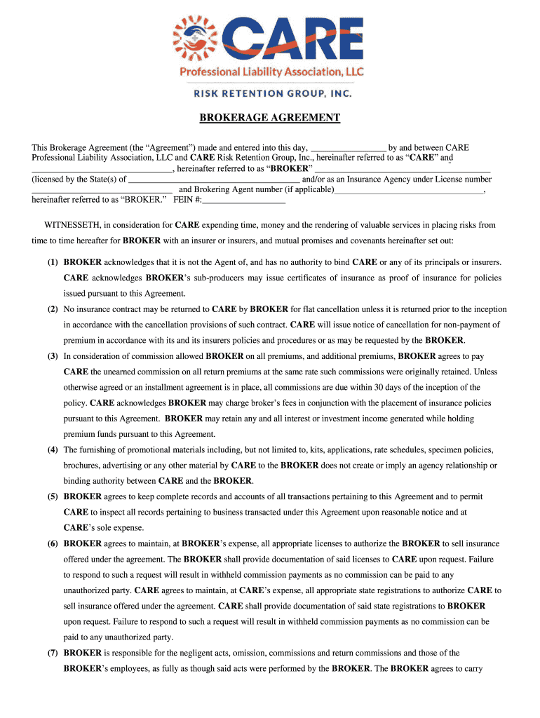 BROKERAGE AGREEMENT This Brokerage Agreement (the Agreement) made and entered into this day, by and between CARE Professional Liability Association, LLC and CARE Risk Retention Group, Inc., hereinafter