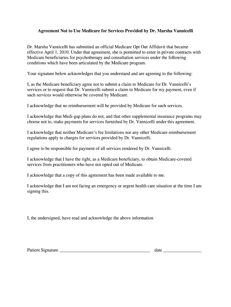 The Medicare Opt-Out Agreement is a healthcare form used by Medicare beneficiaries to acknowledge they will not submit claims to Medicare for services from Dr. Marsha Vannicelli.
