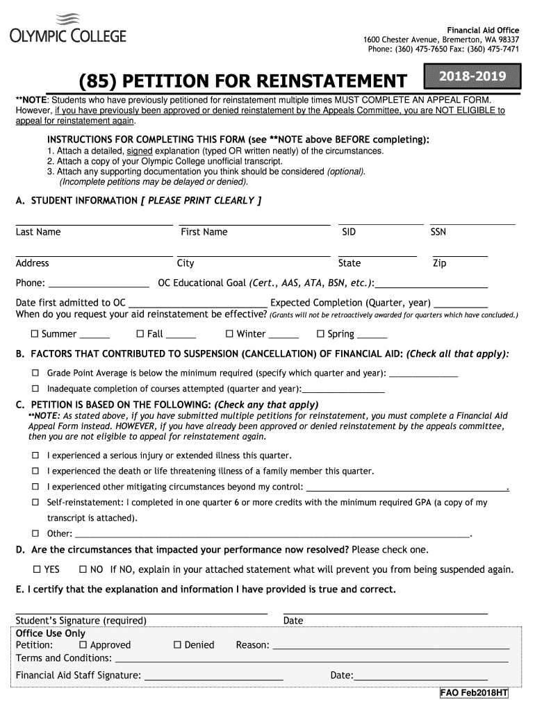 Phone: (360) 4757650 Fax: (360) 4757471(85) PETITION FOR REINSTATEMENT20182019**NOTE: Students who have previously petitioned for reinstatement