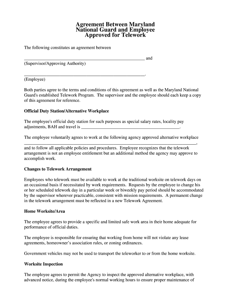 The Maryland National Guard Telework Agreement is an employee management form used by the Maryland National Guard to establish a telework arrangement between supervisors and employees.