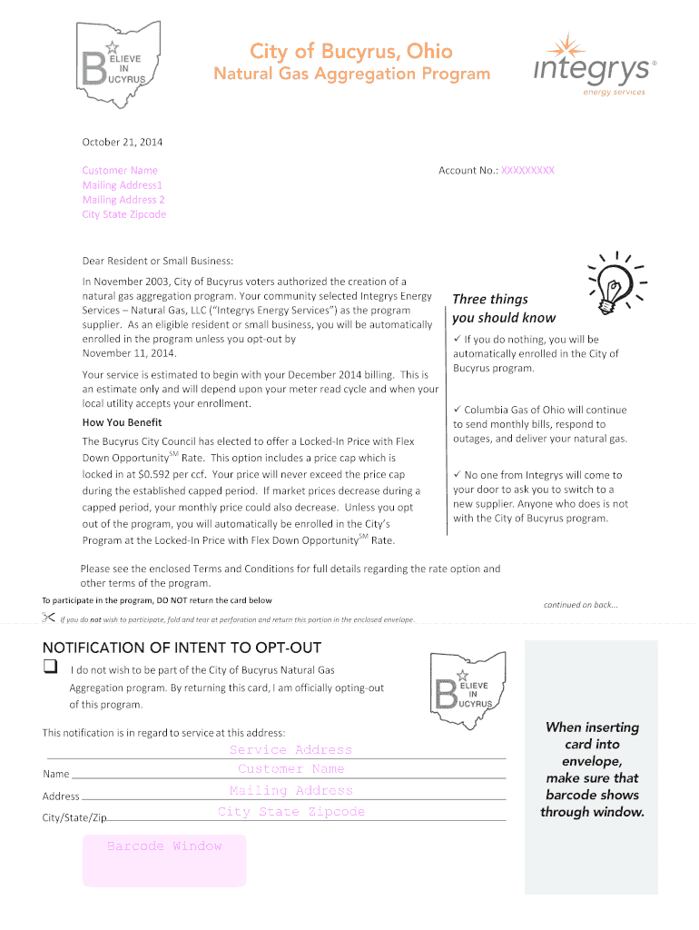 City of Cyrus, Ohio Natural Gas Aggregation ProgramOctober21,2014 CustomerName MailingAddress1 MailingAddress2 CityStateZipcodeAccountNo.:XXXXXXXXX Three things youshouldknow DearResidentorSmallBusiness:InNovember2003,CityofBucyrusvotersauthorizedthecreationofa