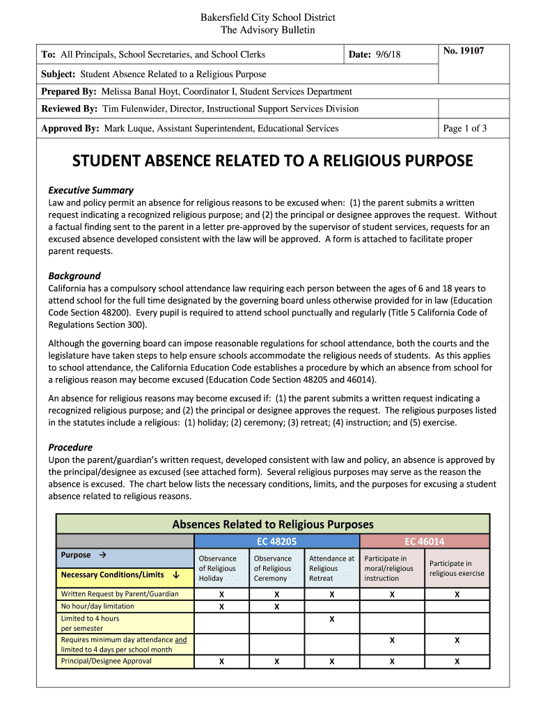 To: All Principals, School Secretaries, and School Clerks No. 19107Date: 9/6/18Subject: Student Absence Related to a Religious Purpose
