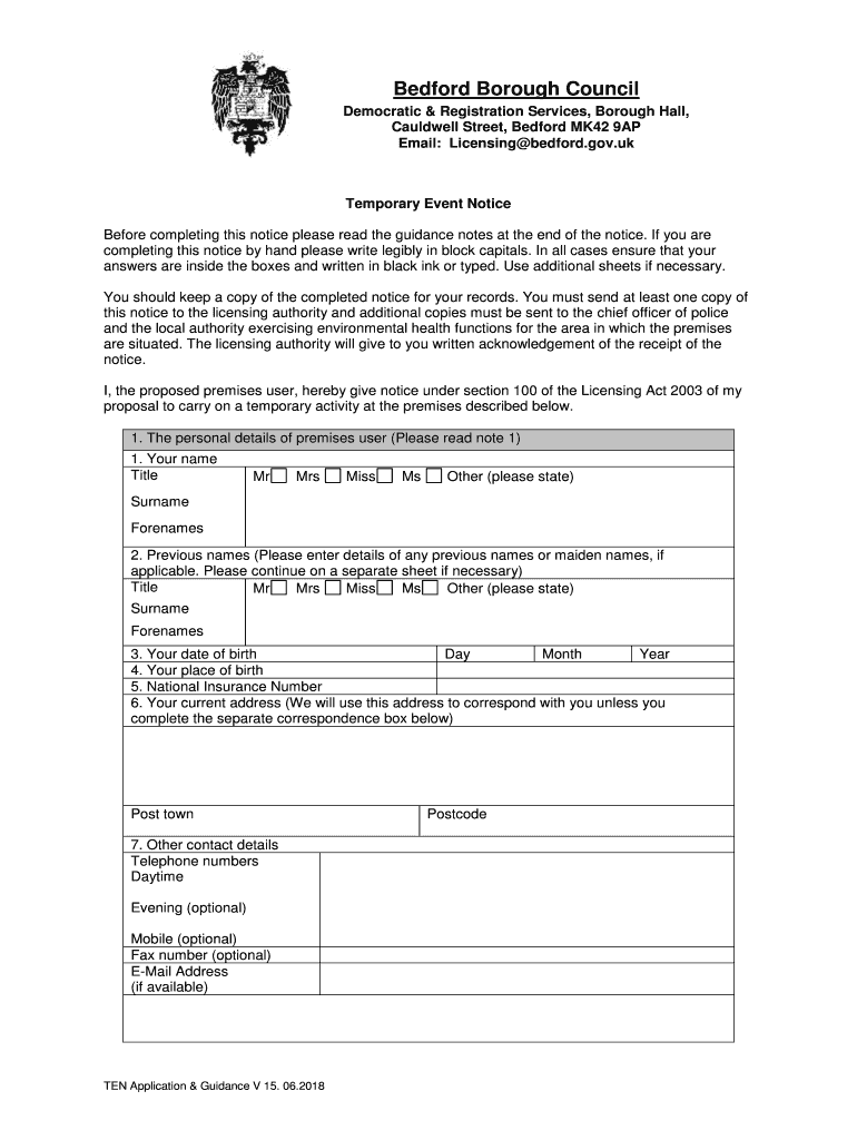Bedford Borough Council Democratic & Registration Services, Borough Hall, Caldwell Street, Bedford MK42 9AP Email: Licensing Bedford.gov.temporary Event Notice Before completing this notice please