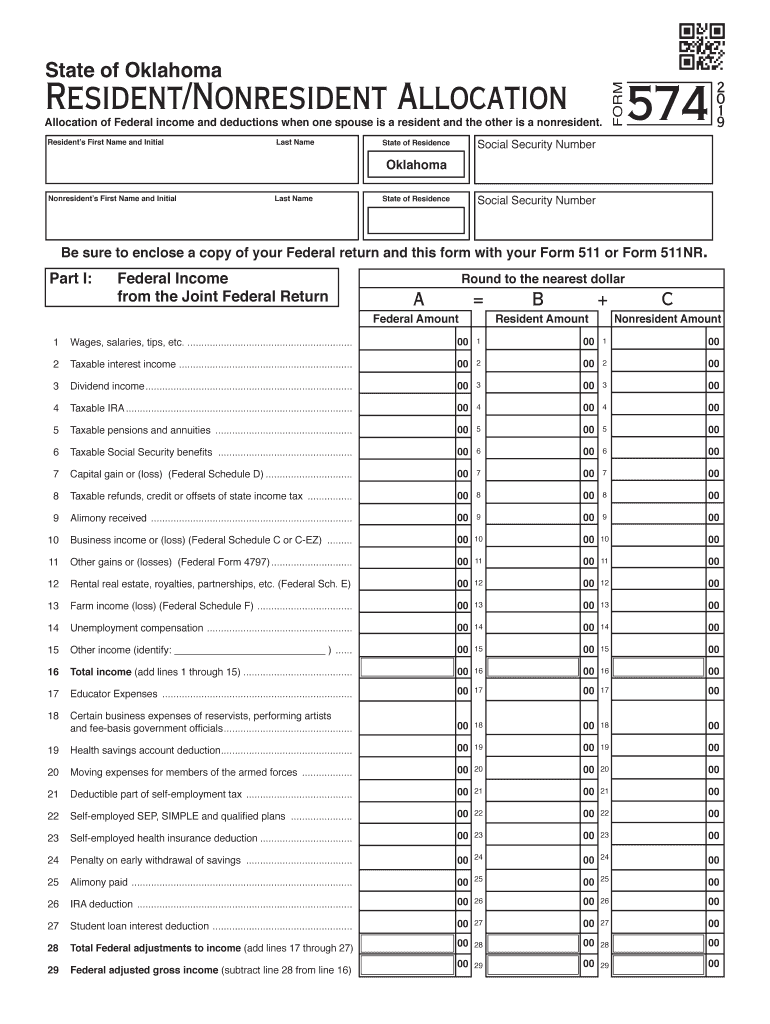 State of OklahomaResident/Nonresident AllocationFORM574Allocation of Federal income and deductions when one spouse is a resident and the other is a nonresident.