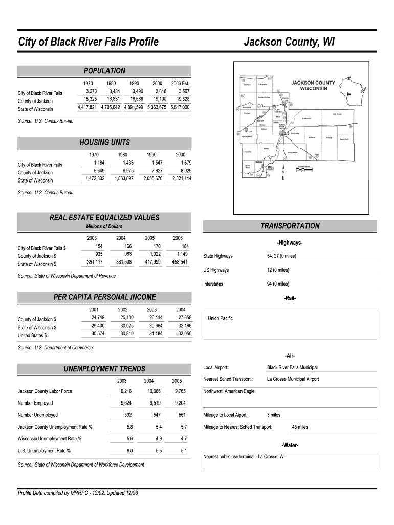 City of Black River Falls Profile Jackson County, WI POPULATION 1970 3,273 City of Black River Falls 15,325 County of Jackson 1980 1990 2000 3,434 16,831 3,490 16,588 3,618 19,100 2006 Est. 3,567