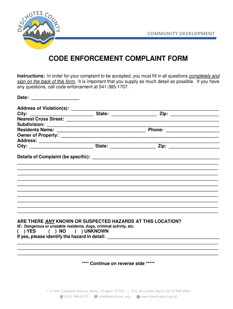 COMMUNITY DEVELOPMENTCODE ENFORCEMENT COMPLAINT FORM Instructions: In order for your complaint to be accepted, you must fill in all questions completely and sign on the back of this form. It is important