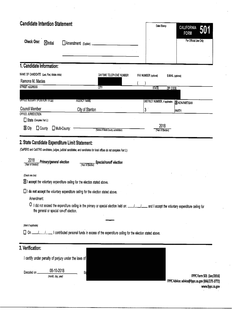 Candidate Intention StatementCheck One: InitialAmendment (Explain)NAME OF CANDIDATE (Last, FIM Middle IntaoDAYTIME TELEPHONE NUMBER FAX NUMBER (peonage MAIL (opeonaoRamona M. Macias (STREET ADDRESSCITYSTATEZIP