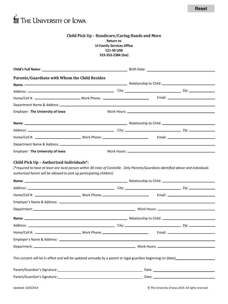 ResetChild Pick Up Handicap/Caring Hands and More Return to UI Family Services Office 12150 USB 3193532384 (fax)Child's Full Name:Birth Date:Parents/Guardians with Whom the Child Resides Relationship