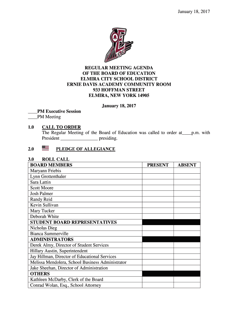 January 18, 2017REGULAR MEETING AGENDA OF THE BOARD OF EDUCATION ELMIRA CITY SCHOOL DISTRICT ERNIE DAVIS ACADEMY COMMUNITY ROOM 933 HOFFMAN STREET ELMIRA, NEW YORK 14905 January 18, 2017, PM Executive