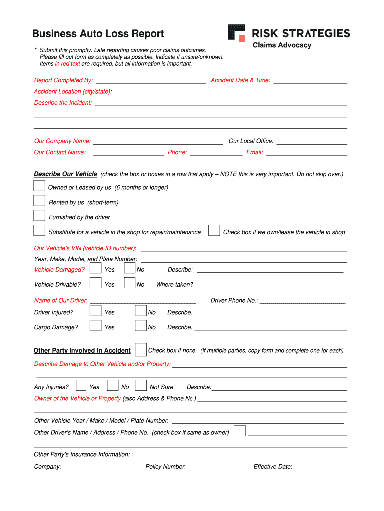 Business Auto Loss Report * Submit this promptly. Late reporting causes poor claims outcomes. Please fill out form as completely as possible. Indicate if unsure/unknown. Items in red text are required,