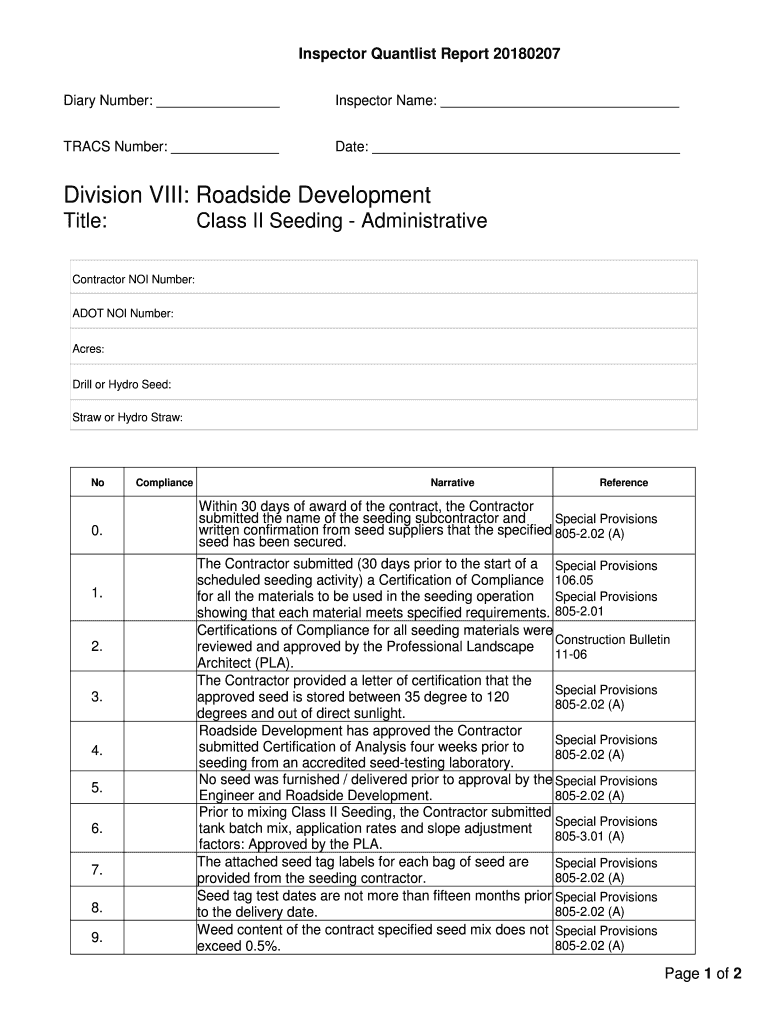 Inspector Quantity Report 20180207 Diary Number: Inspector Name: TRACK Number: Date: Division VIII: Roadside Development Title:Class II Seeding AdministrativeContractor NOI Number: ADOPT NOI Number:
