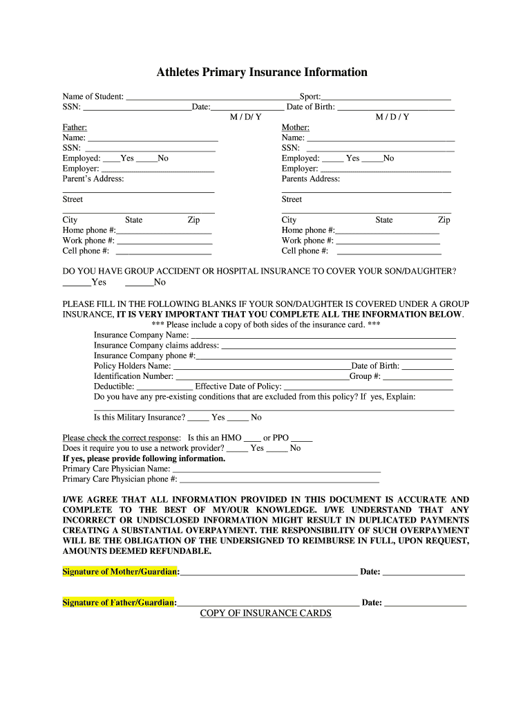 Athletes Primary Insurance Information Name of Student: Sport: SSN: Date: Date of Birth: M / D/ Y M/D/Y Father: Mother: Name: Name: SSN: SSN: Employed: Yes No Employed: Yes No Employer: Employer: