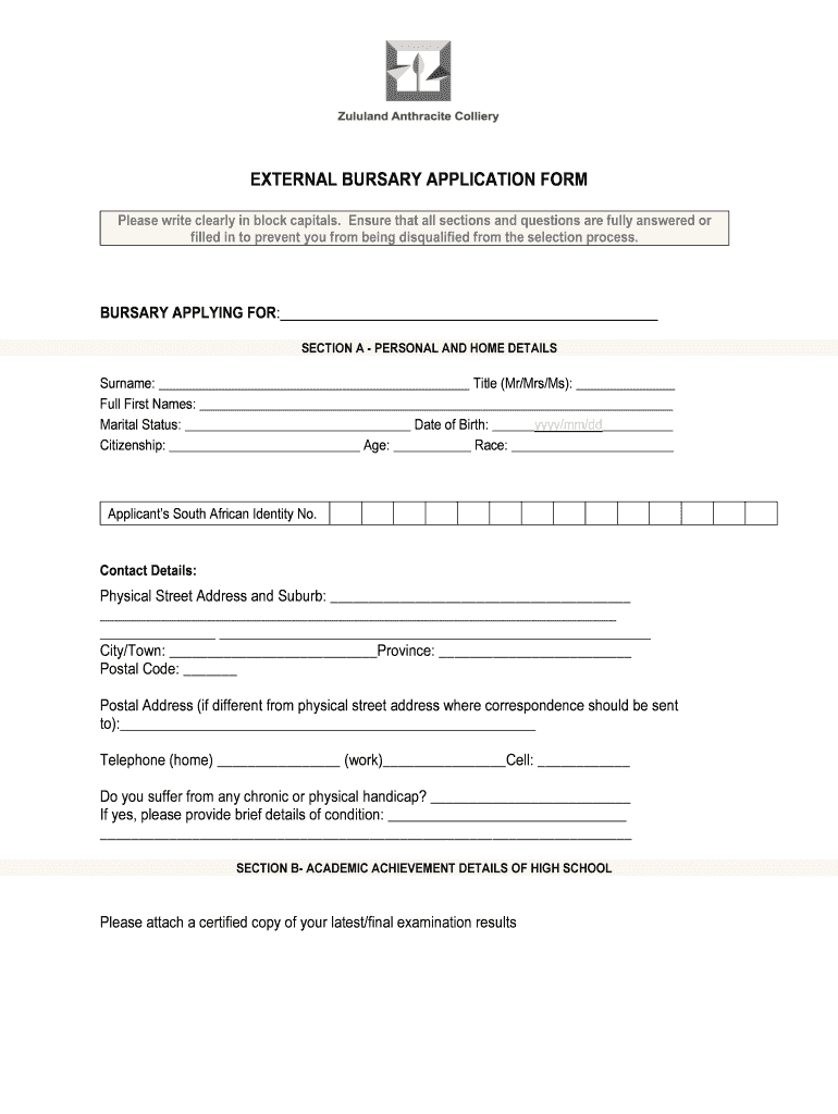 EXTERNAL BURSARY APPLICATION FORM Please write clearly in block capitals. Ensure that all sections and questions are fully answered or filled in to prevent you from being disqualified from the selection
