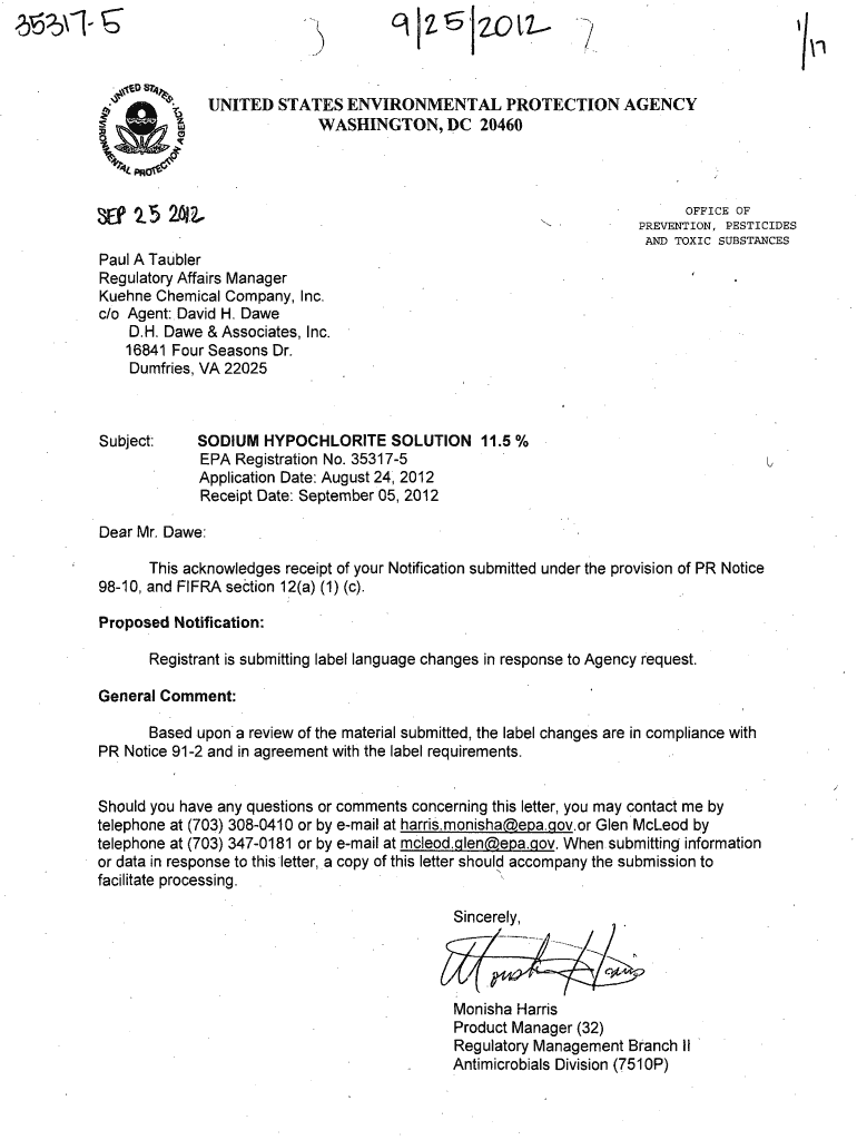 'In UNITED STATES ENVIRONMENTAL PROTECTION AGENCY WASHINGTON, DC 20460X. . 'OFFICE PREVENTION, PESTICIDES AND TOXIC SUBSTANCESPaulATaubler Regulatory Affairs Manager Kühne Chemical Company, Inc.
