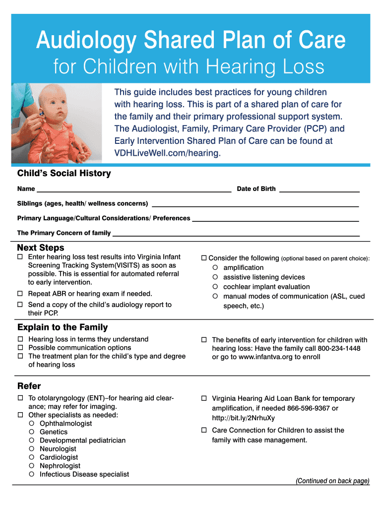 Audiology Shared Plan of Care for Children with Hearing Losses guide includes best practices for young children with hearing loss. This is part of a shared plan of care for the family and their primary