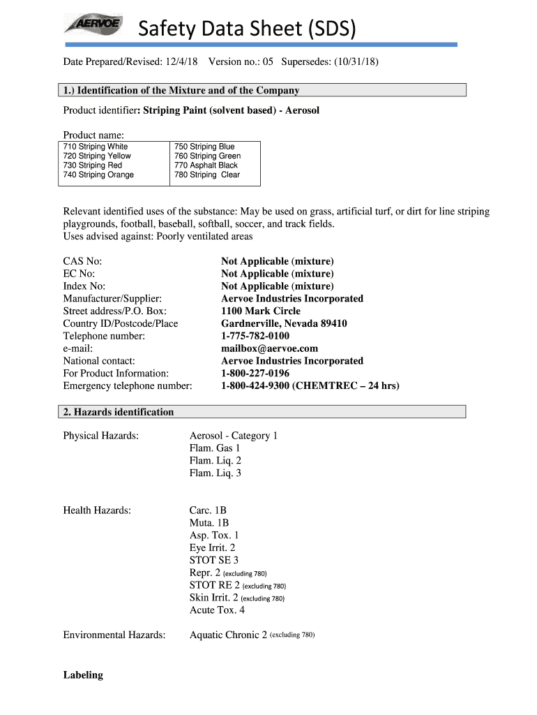 Safety Data Sheet (SDS) Date Prepared/Revised: 12/4/18Version no.: 05 Supersedes: (10/31/18)1.) Identification of the Mixture and of the Company Product identifier: Striping Paint (solvent based)