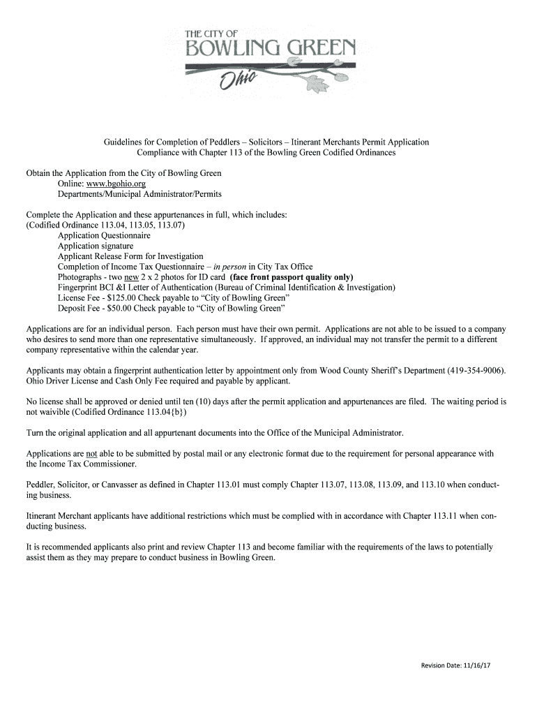 Guidelines for Completion of Peddlers Solicitors Itinerant Merchants Permit Application Compliance with Chapter 113 of the Bowling Green Codified Ordinances Obtain the Application from the City of