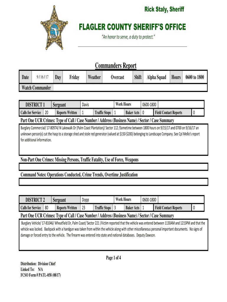Rick Italy, SheriffFLAGLER COUNTY SHERIFF IS OFFICE An honor to serve, a duty to protect. Commanders Report Date9 / 16 / 17DayFridayWeatherOvercastShiftAlpha SquadHours0600 to 1800Watch Commander